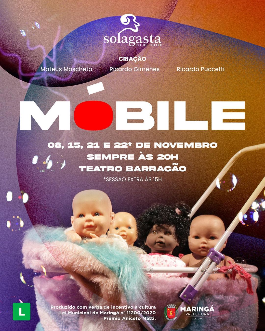 Acontecerá hoje (08), às 20 horas, a primeira exibição da peça Móbile, no Teatro Barracão. A peça é realizada de forma colaborativa por Mateus Moscheta, Ricardo Gimenes e o ator, palhaço e pesquisador, Ricardo Pucceti, do LUME Teatro, de Campinas (SP). O projeto foi contemplado pelo prêmio Aniceto Matti e terá exibição gratuita nos dias 8, 15, 21 e 22 de novembro, com uma sessão extra nos dias 22, às 15 horas.