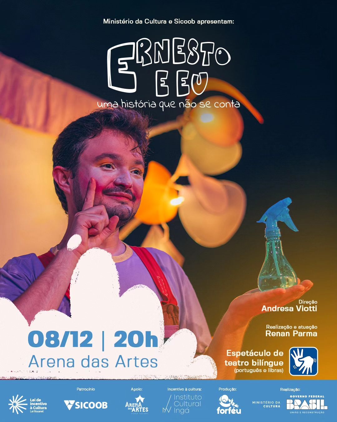 Acontecerá, nesta sexta (08), às 20 horas a apresentação da peça ”Uma história que não se conta: Ernesto Eu”, no Arena das Artes. A exibição é gratuita e livre para todos os públicos. O espetáculo é um solo infantil bilíngue, sendo apresentado em português e libras, com duração de 40 minutos.