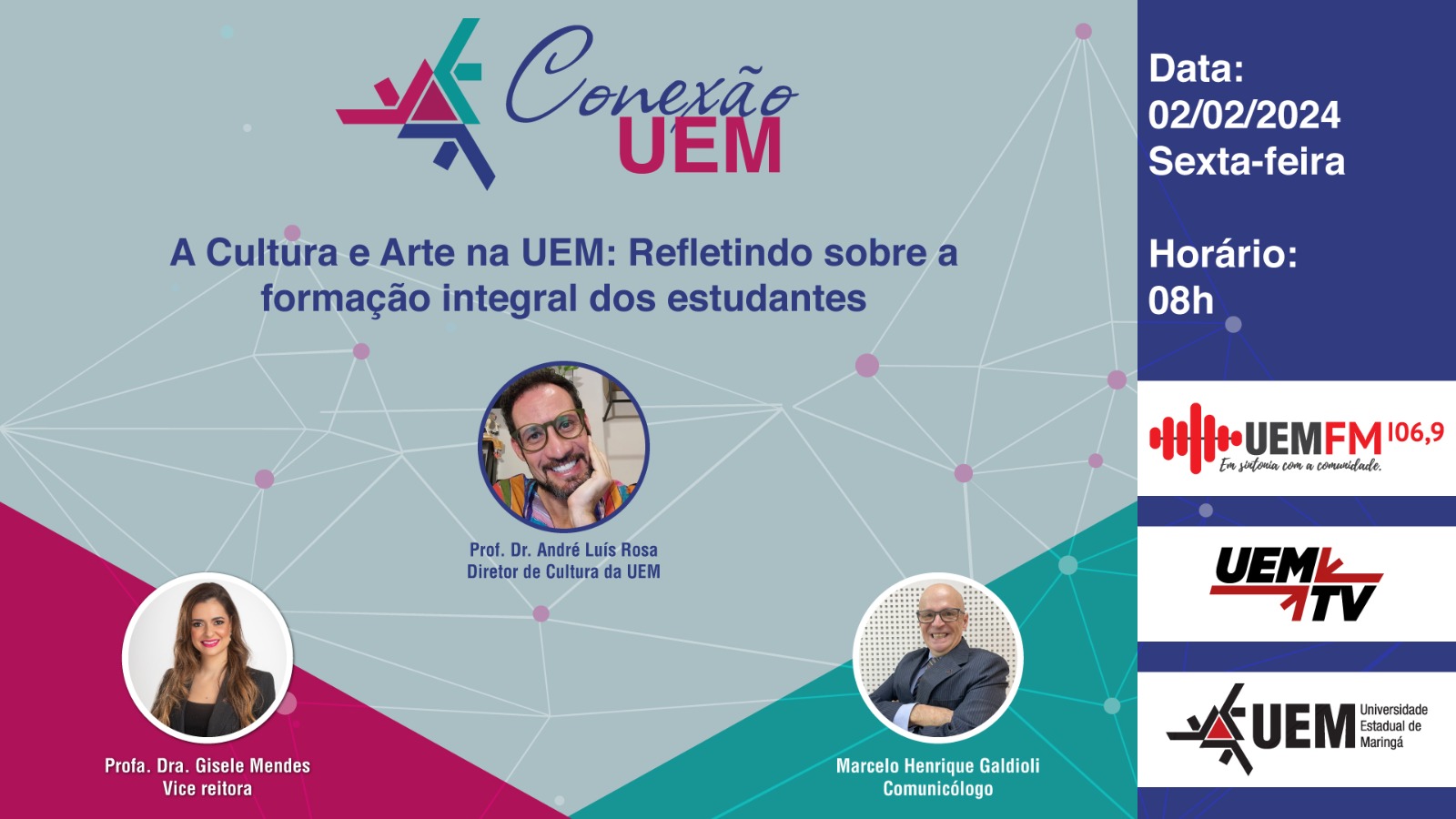 Participam do programa a vice-reitora da Universidade Estadual de Maringá (UEM), Gisele Mendes e o diretor de Cultura da instituição, André Luís Rosa. A apresentação fica a cargo do comunicólogo da rádio UEM FM, Marcelo Henrique Galdioli.