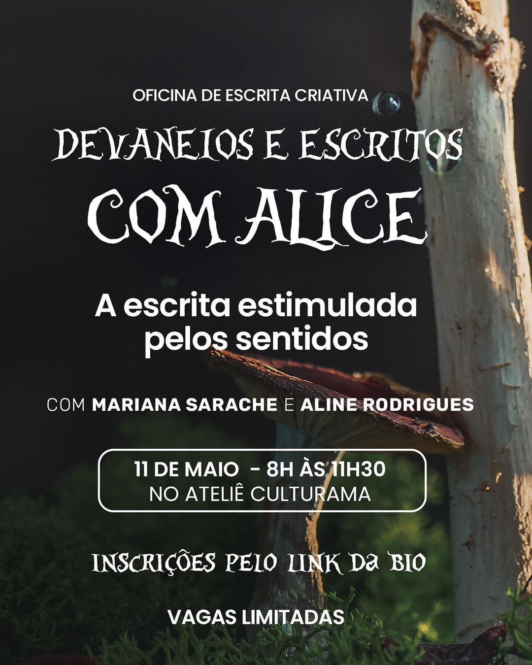 Acontecerá, no dia 11 de maio, a oficina “Devaneios e escritos com Alice- A escrita estimulada pelos sentidos”, ministrada pelas professoras Mariana Sarache e Aline Rodrigues.